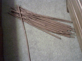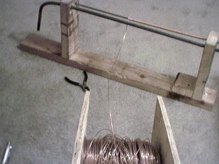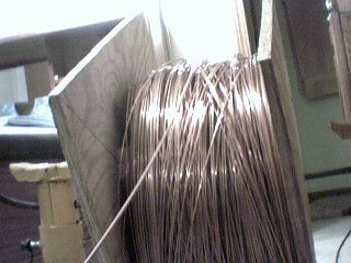 Starting this project, was a little interesting. The wire came to me in a spool without a core, leaving the wire very suceptable to tangles and kinks while coiling. I had to build myself a spool around the wire so that it would not unravel or tangle. doing this I took 16"x16" sheets of plywood and four 6" 2x2s and constructed a square spool around the wire with a 3/8" hole through the center.