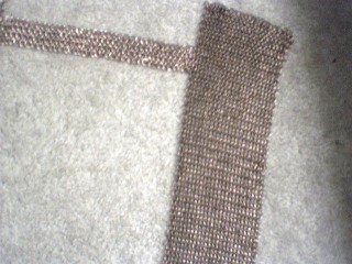An overall shot of my progress as of September 14th, 2003. the wider section is going to be over my shoulder, and the narrow strip protruding out across that, is a referance for me on how wide my neck is. The strip for the neck is about 8" wide and is 1 3/4" long. The larger section is 5" wide and 15 1/4" long with a small chunk of 1 1/4" wide by 1 3/4" long hanging from the side that will be towards the neck so that I can attach the stip that will be running across the front of the neck. |